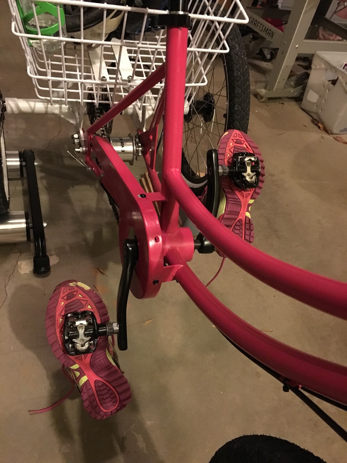 I spent a lot of time trying to "winterize" Elena's trike. I made a clip-in shoe by putting the screw plate in an old sneaker, and attaching a SPD cleat (this typically wouldn't work for kids b/c pedaling with this on a soft shoe, like a sneaker, would bruise the foot; b/c E wears SMOs, it's fine). I also found a trike trainer, which was gifted to us by SportCrafters--it's a roller designed for single drive cycles (like E's trike, which has a single-rear drive). We try to practice 2x/week, but with her schedule it can be tough. Elena likes to try different positions on her trike, which is great--but these don't work as well off the trainer (she can tip). My goal with the clip-ins is to try to work on her endurance (we are at 20+ minutes on the trainer) and try to have her realize where her foot should be on the pedal when she rides (often she puts her heel on the pedal instead of the ball of the foot).